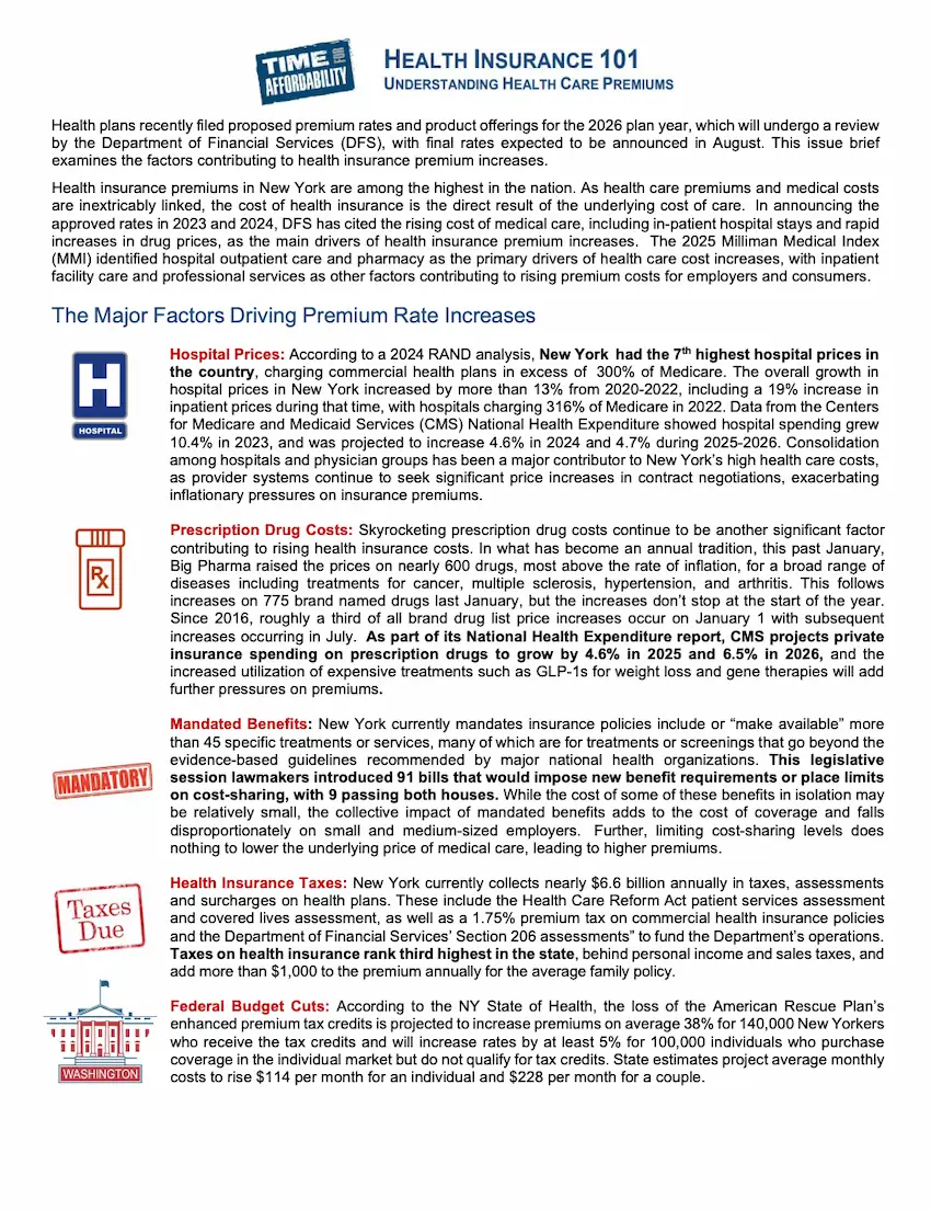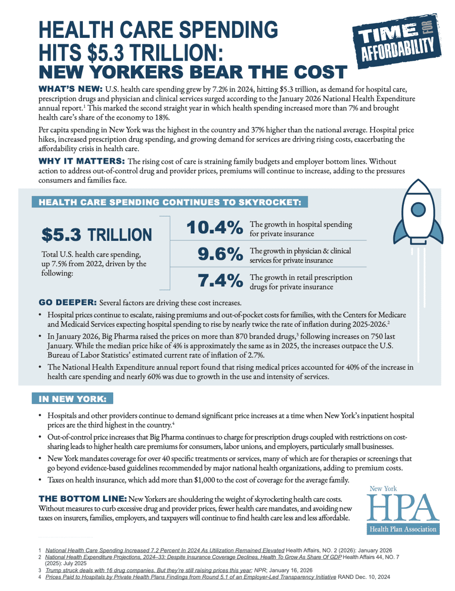 New York’s per capita spending on health care is 37% higher than the national average. The cost of health insurance is the direct result of the underlying cost of care and escalating medical costs directly drive health care premiums.