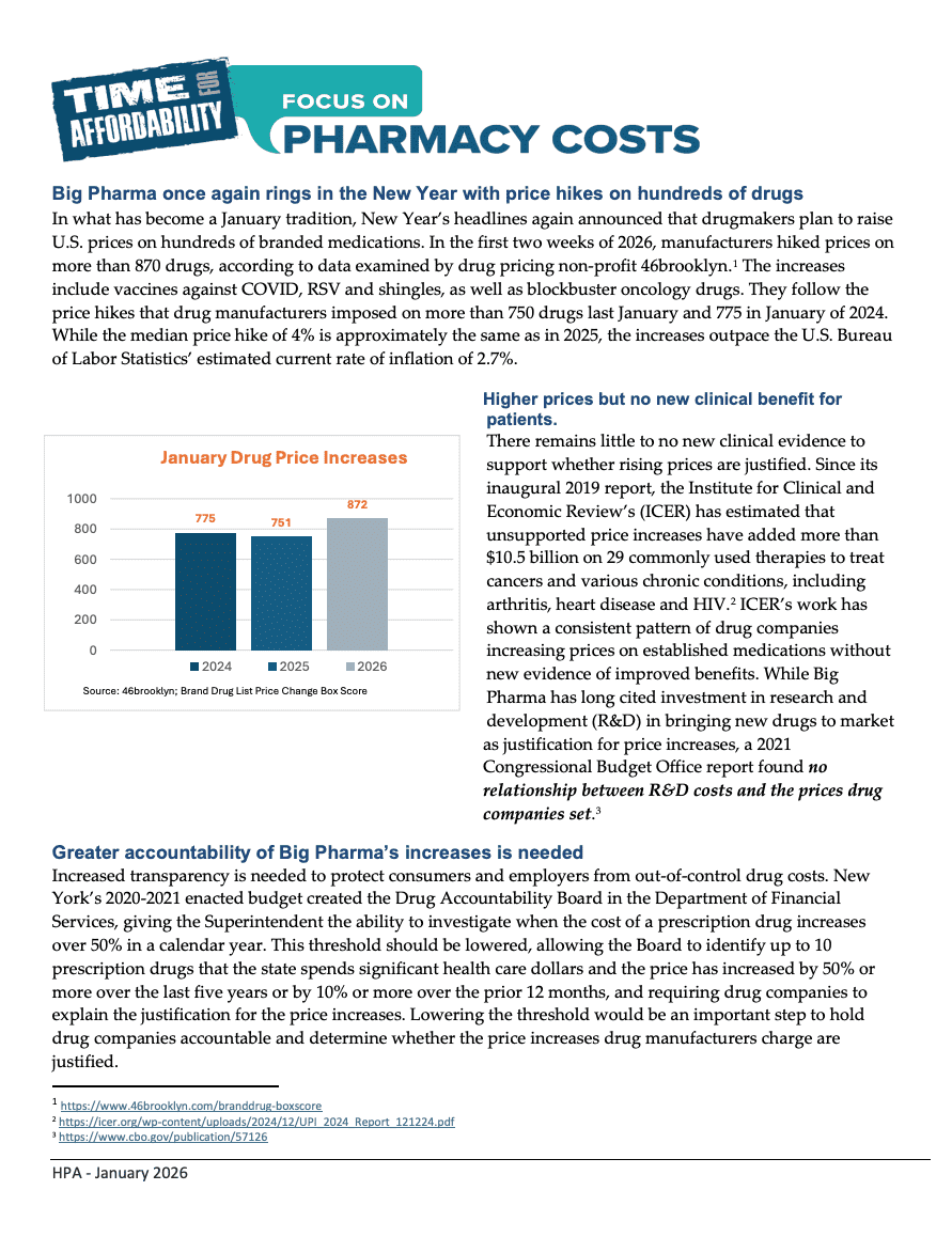 Skyrocketing prescription drug costs continue to be one of the largest drivers of health insurance costs. Big Pharma raises prices without warning and too often there are no new clinical improvements to justify those price hikes.